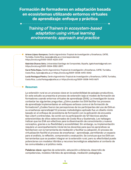 La extensión rural es un proceso clave en la sostenibilidad de paisajes productivos. En este estudio se presenta el proceso de extensión bajo el modelo de formación de formadores usando entornos virtuales de aprendizaje (EVA). La investigación busca contestar las siguientes preguntas: ¿Cómo pueden los EVA facilitar los procesos de aprendizaje implementados en enfoques exitosos como el de formación de formadores? ¿Cuáles fueron las percepciones de los participantes del uso de EVA en su enseñanza-aprendizaje? El proceso metodológico aplicado fue un diseño mixto basado en el enfoque de ecosistema de formación con la aplicación de encuesta tipo Likert y entrevistas. Se contó con la participación de 121 técnicos adultos extensionistas de sitios seleccionados de Costa Rica y Guatemala. Los hallazgos indican que los EVA son efectivos para la diseminación de conocimiento y nuevos conceptos, gracias a su flexibilidad y accesibilidad. Sin embargo, su implementación requiere un acompañamiento inicial de los docentes para que los aprendices se familiaricen con la herramienta de mediación y facilitar su adopción. El proceso de virtualización facilitó el proceso de enseñanza - aprendizaje, permitiendo un espacio para el análisis, la reflexión, comprensión y evaluación. Se concluye que los EVA son herramientas que se pueden integrar en la extensión rural, pero su efectividad puede potenciarse con modelos híbridos y recursos tecnológicos adaptados al contexto de las comunidades y el público meta.